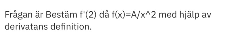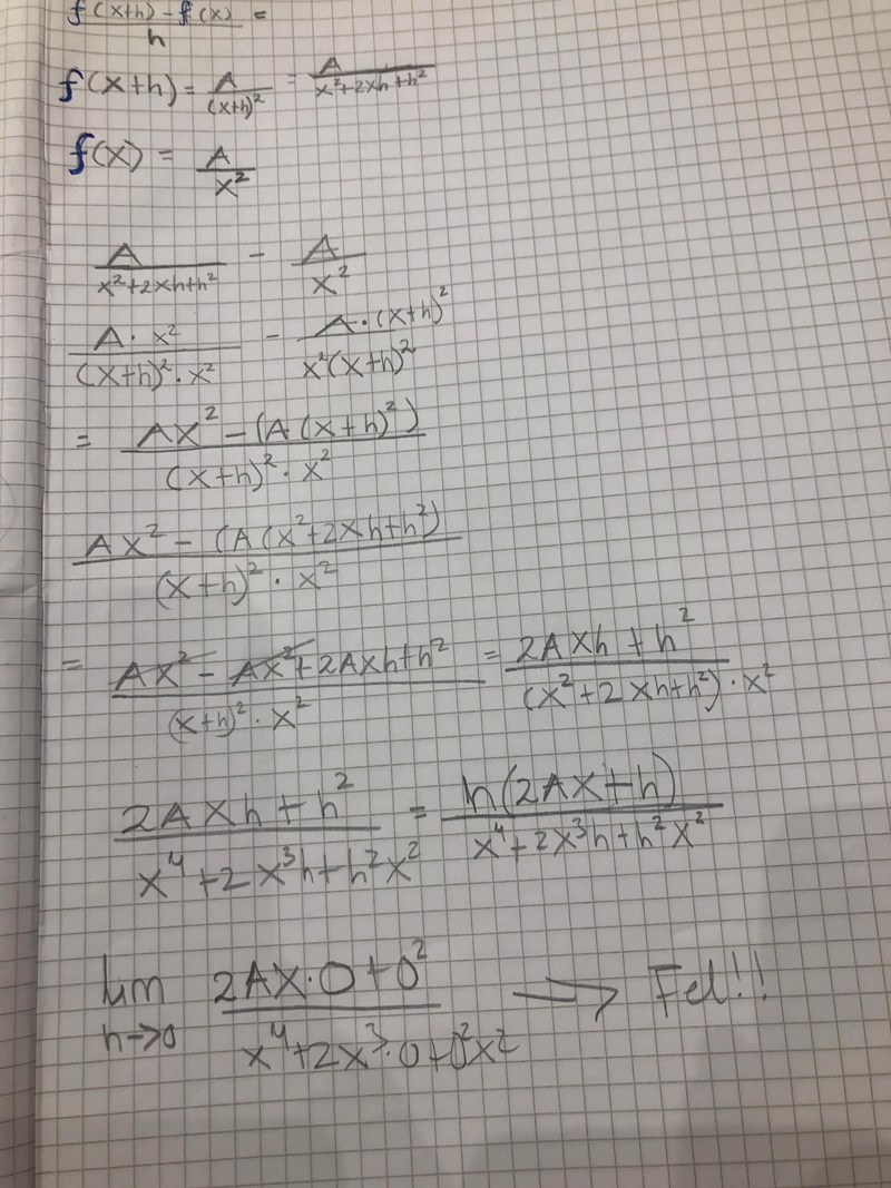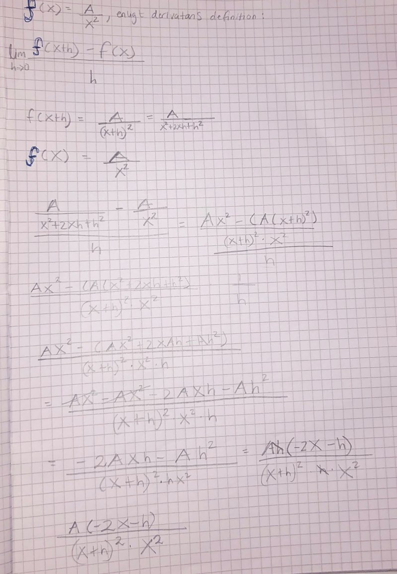 Såhär: f(x+h)-f(x)h=...=A(-2x-h)(x+h)2·x2