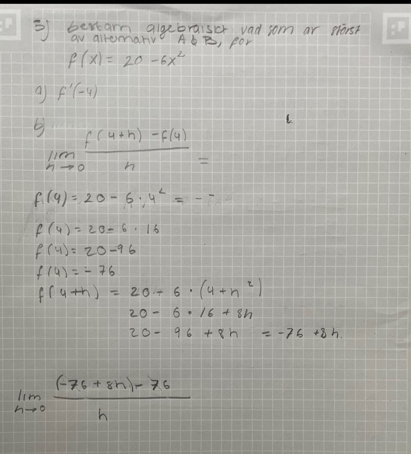 när jag sätter in dom i formeln för derivatans definition får jag (-76 + 8h)-76/h och jag tror inte jag ska sluta där, men jag vet inte hur jag ska fortsätta.