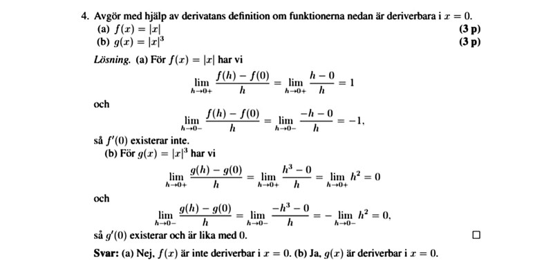 oggih skrev:Det är för att frågan bara handlar om huruvida derivatan existerar i den specifika punkten . Alltså ska vi undersöka om följande gränsvärde existerar: