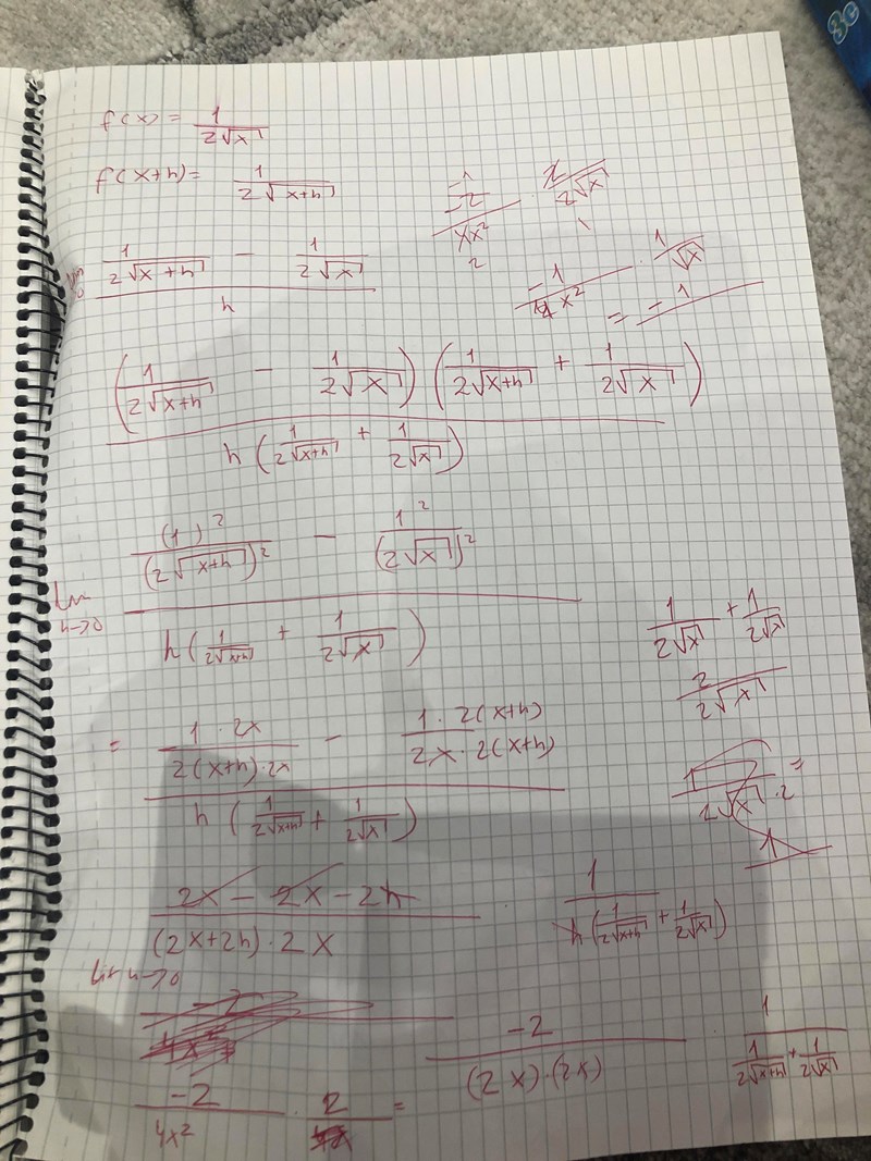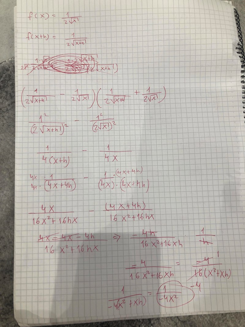 Jag har försökt att förenkla uttrycket man först får och sedan sätta lim h->0 men får fel svar.