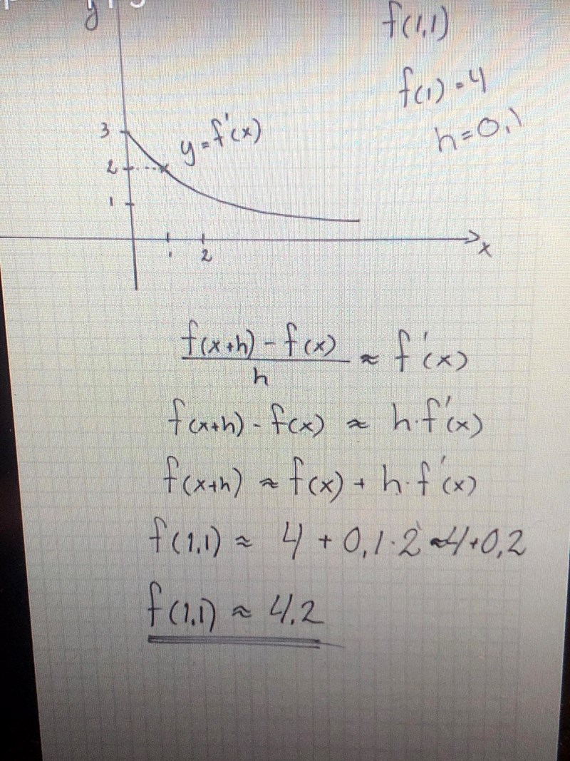 Vi vet utifrån grafen att f'(1)=2, dvs när x=1 så ökar f(x) 2 gånger fortare än x. För att beräkna närmevärdet tänker vi "hur blir det om funktionen fortsätter öka lika snabbt?" Om x ökar med 0,1 ökar alltså f(x) med 0,2. Alltså har vif(1,1)f(1)+0,2=4,2 .