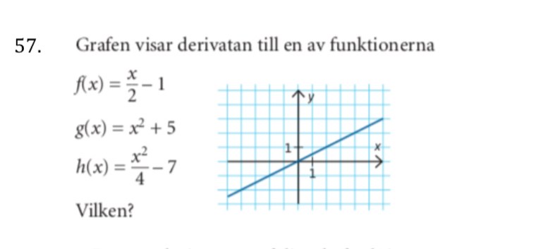 TÀnk pÄ att det Àr derivatan det Àr frÄga om. Derivatan till blir , d.v.s. en linje med -vÀrde noll. Det har ju inte linjen i diagrammet, eller hur?
