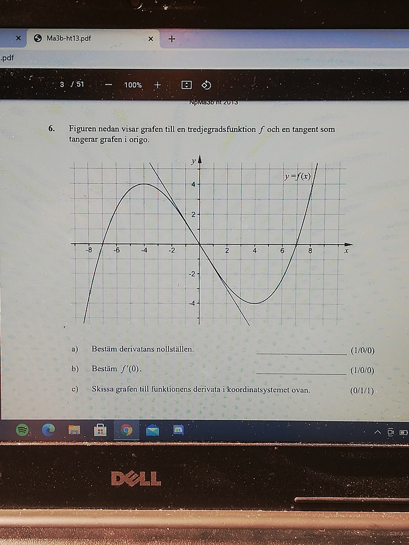Hej! Jag undrar hur man tar reda på var derivatans graf skär y-axeln. Jag har testat att sätta in x=0, men då får jag helt fel svar. Vet någon hur man ska göra? (jag lägger in bild nedan på hur uppgiften ser ut. Det är c som jag behöver hjälp med. Jag vet redan att funktionens graf för derivatan skär x i x1=-4 och x2=4)