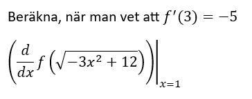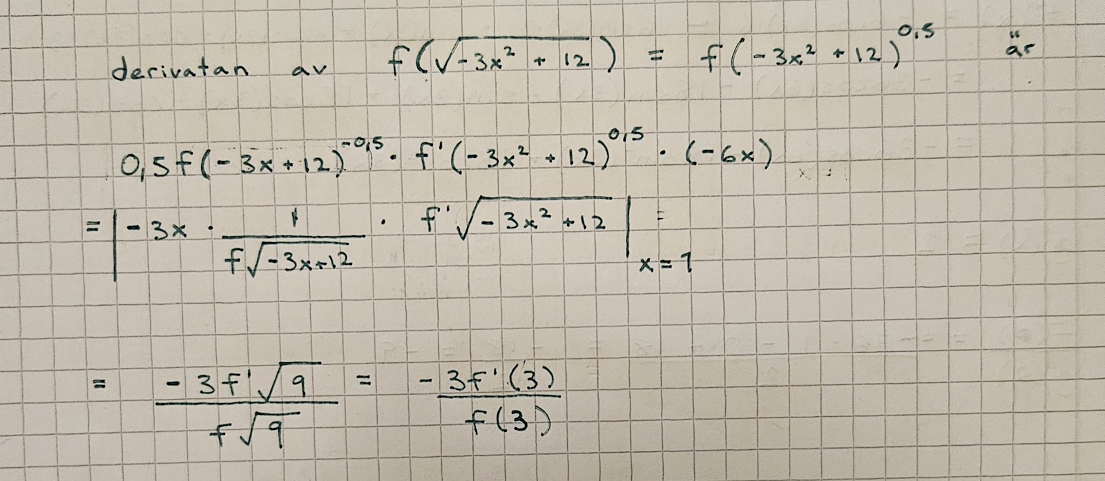 Om jag använder x=1 för f(x)=sqrt(-3x^2+12) i nämnaren får jag rätt svar. Vad gör jag för fel som kommer fram till att det ska stå f(3) i nämnaren?