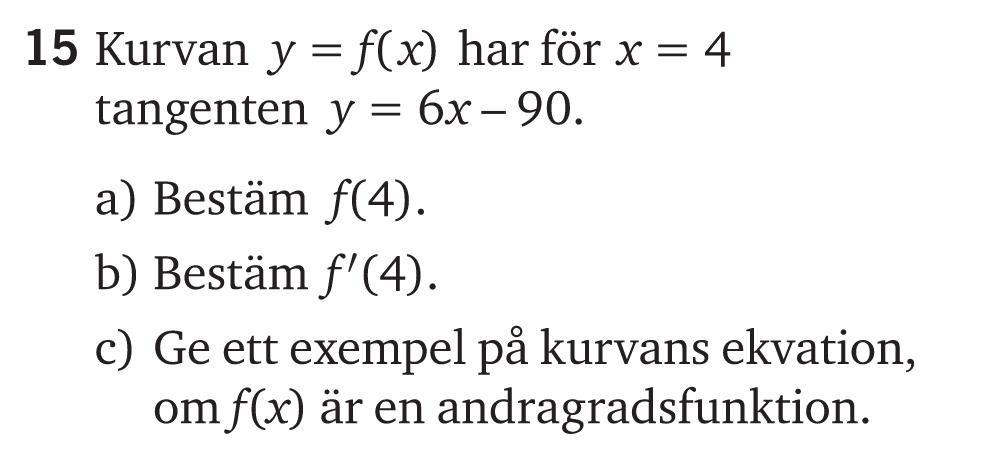 Hej! Jag har lite problem med denna uppgift. Framförallt problem med att tolka den. När jag först läste den tolkade jag det som att f'(4) = 6x-90 --> 6(4)-90