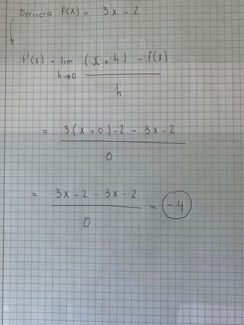 Derivera f(x) = 3x -2 utifrån derivatans definition