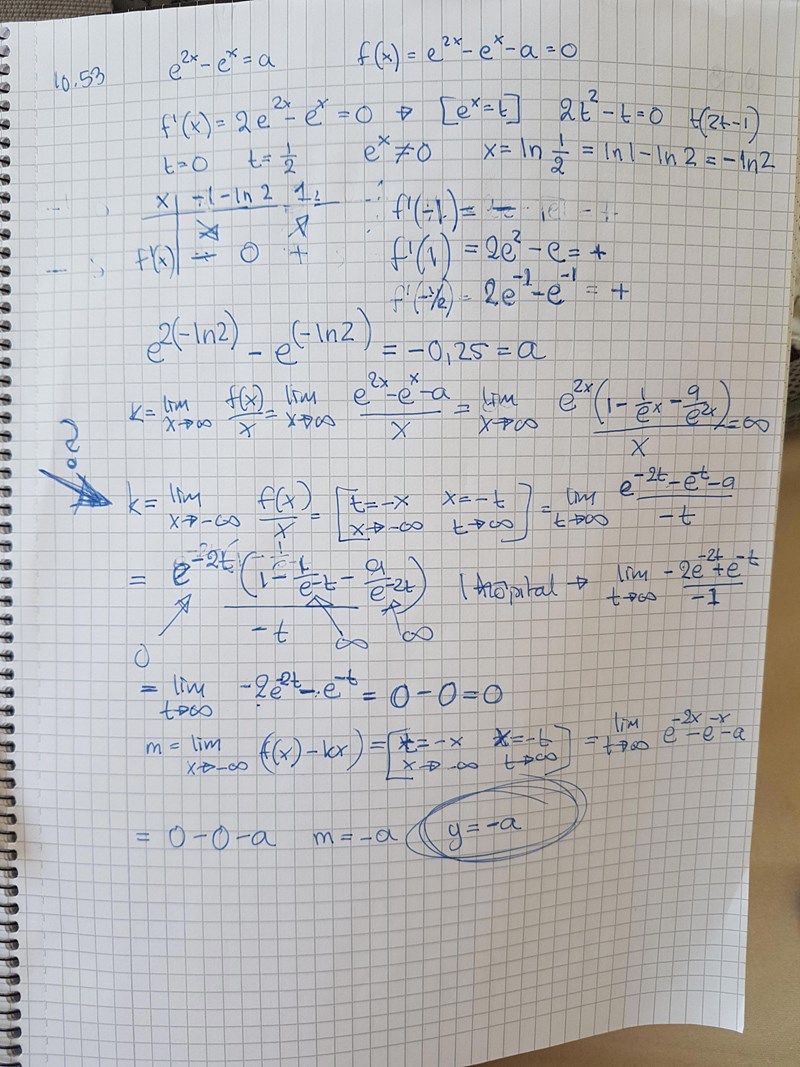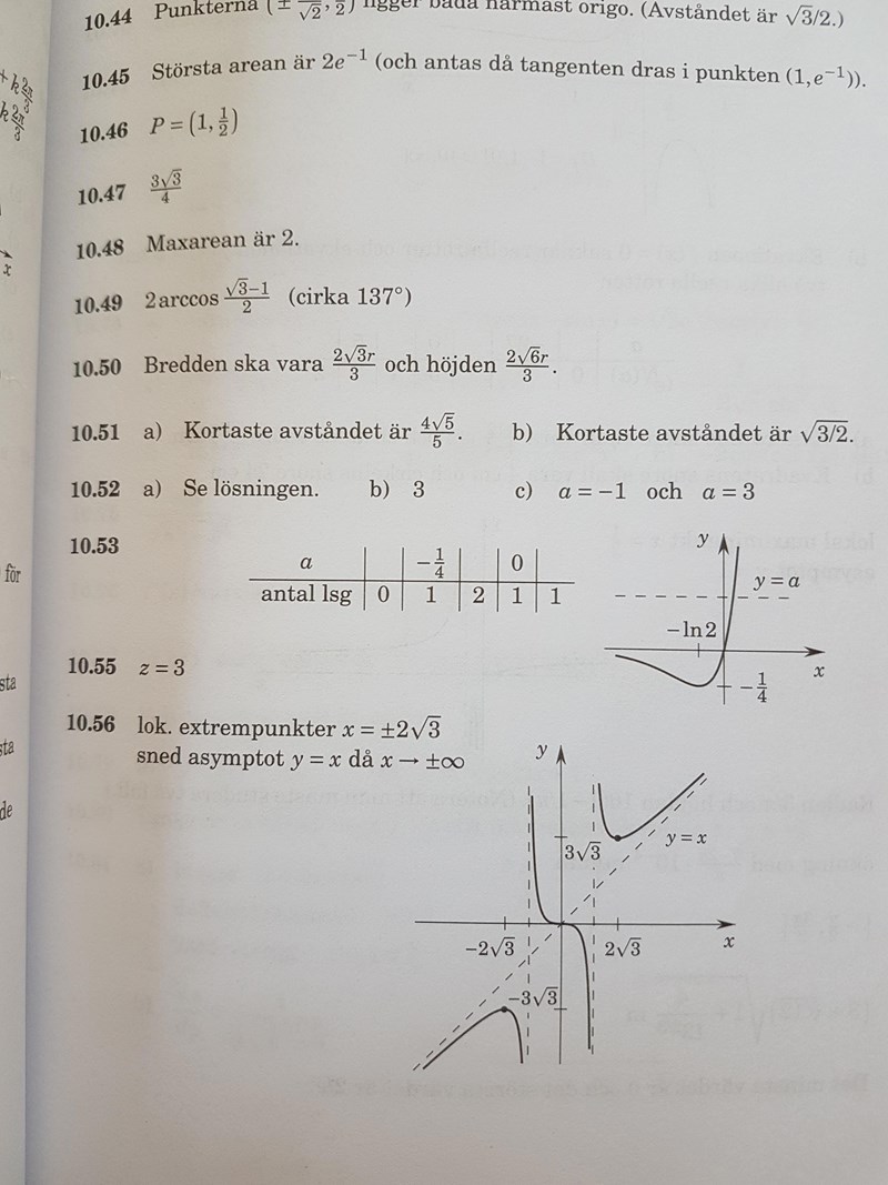 Jag provade räkna ut nollställena och ta reda på asymptoter för att kunna rita. När jag jämför det jag fått fram påminner det en del om facit men till skillnad från facit (y=a) får jag (y=-a) och jag misstänker att jag gjort något fel vid uträkning av ev asymptot då x->-inf. Har någon möjlighet att kolla på detta? Jag bifogar bild på min lösning och facit. Jag har inte ritat än då jag inte blev klok på y=-a
