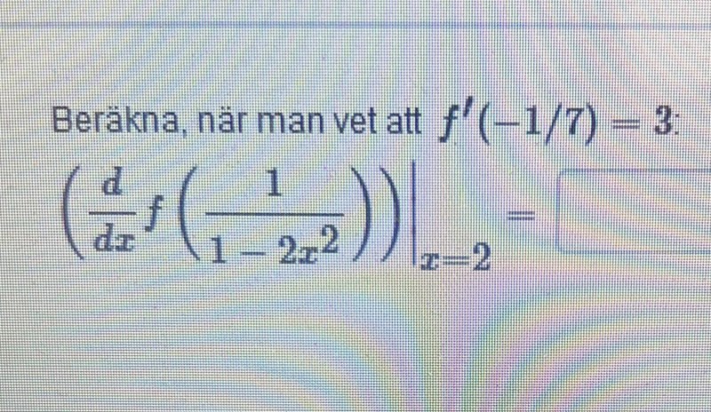 Du skall alltså beräkna derivatan av f(x) om x =-1/7. Läs det som står på översta raden i bilden. Där har du svaret.