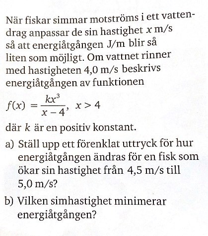 Jag är på fråga a). Alltså ska jag räkna ut energiåtgången i J/m. Jag förstår helt ärligt inte vad det är man ska göra. Det svar jag får är att det skulle kräva ungefär 57 J/m genom att ta f(5) - f(4,5). Min lärare sa att jag skulle ta f'(5) - f'(4,5), men det ger inte heller rätt svar, det ger istället 193 J/m..