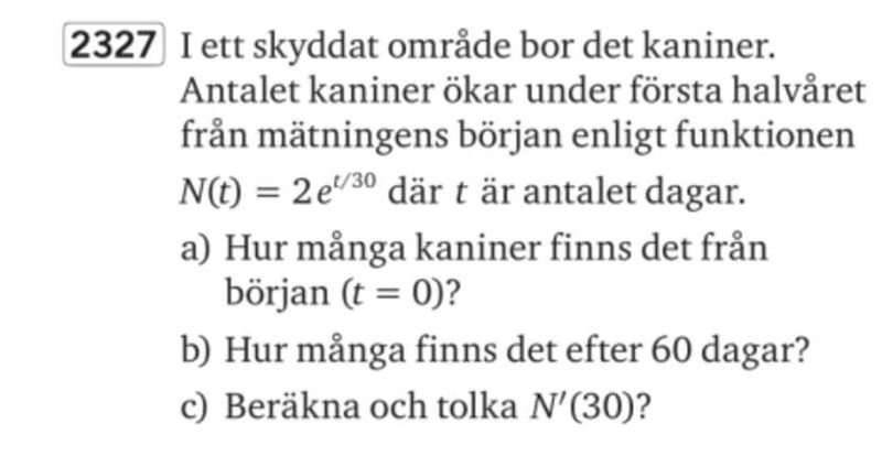 N’ = 2 x 1/30 x e^(t/30) alltså 1/15 * e^(t/30), kolla deriveringsreglerna för e^kx, vad är k och vad är x i ditt fall?