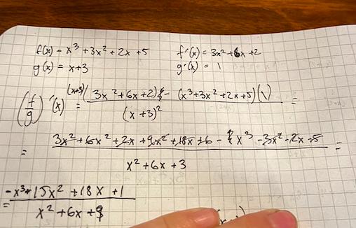om jag använder derivata av en kvot regeln som känns rimligast eftersom reciproka regeln kräver att man ska kunna derivera funktionen redan innan. Så får jag detta