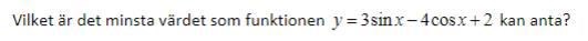 Derivata behövs faktiskt inte här. På samma sätt som du slog ihop trigfunktionerna i derivatan kan du slå ihop dem i funktionen . Väl där kan du använda att det minsta möjliga sinusvärdet är -1.