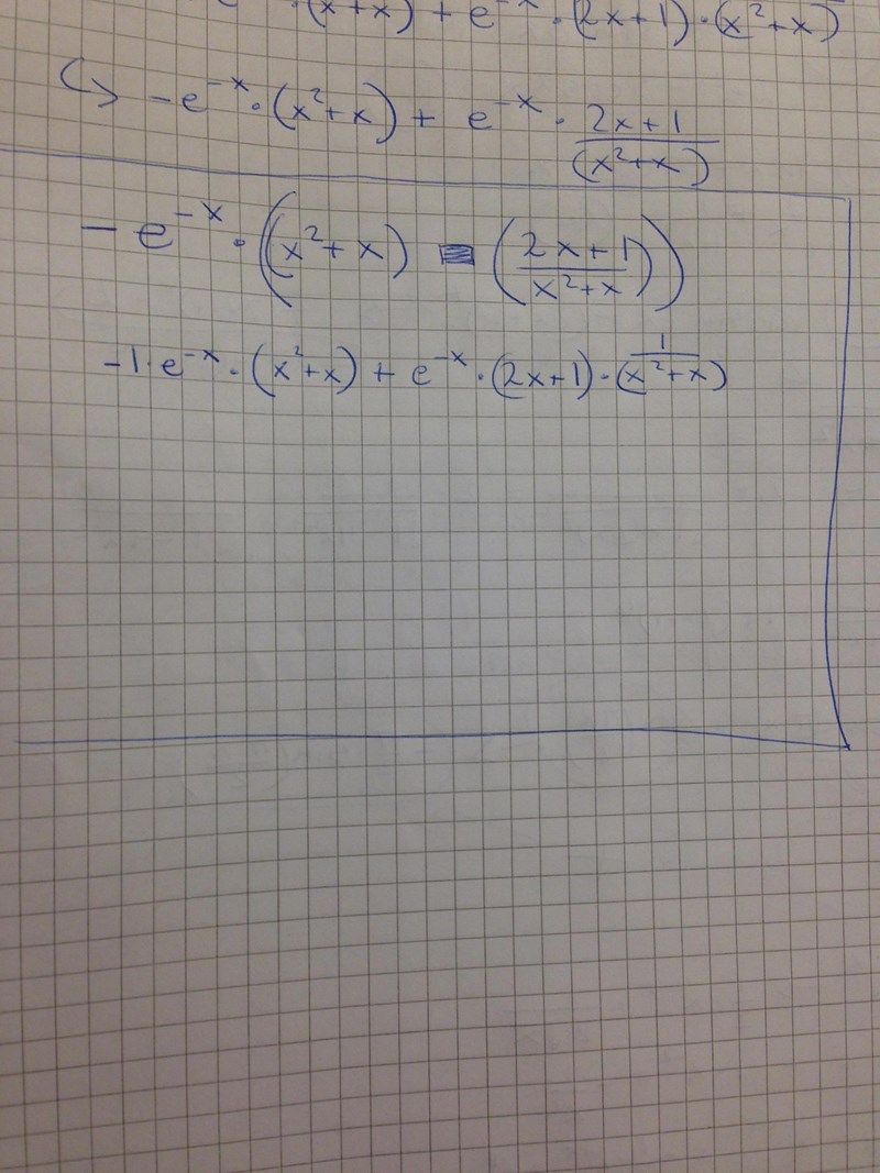 Jag tänkte man skulle derivera en funktion * en funktion. Så derivatan av e^-x * den andra funktionen PLUS e^-x * derivatan av den inre funktionen * derivata av den yttre (x²+x)¹ --> 1*(x²+x)^(-1) ...