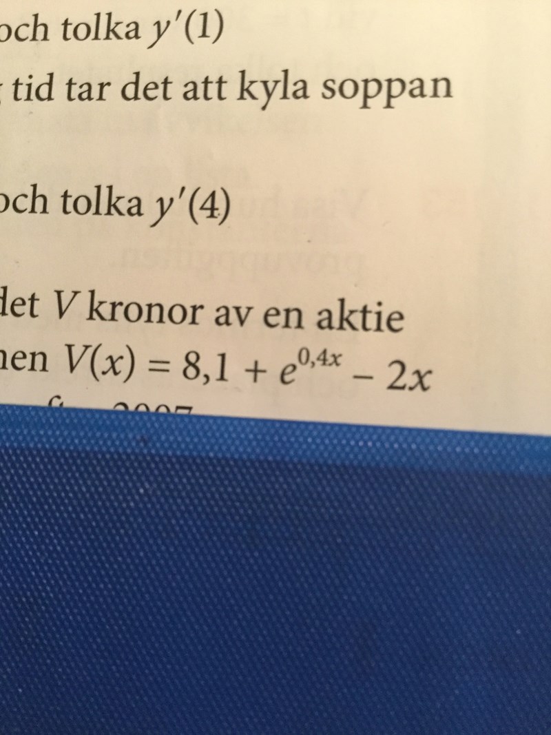 Min fråga hittade jag på själv. Därför behövde ni inte se uppgiften. Tack Bubo, du svarade nästan på min fråga. Gäller "derivatan av e^(0.4x) är 0.4 * e^(0.4x)" när e^(0.4x) finns mitt i en funktion också? Alltså alltid?