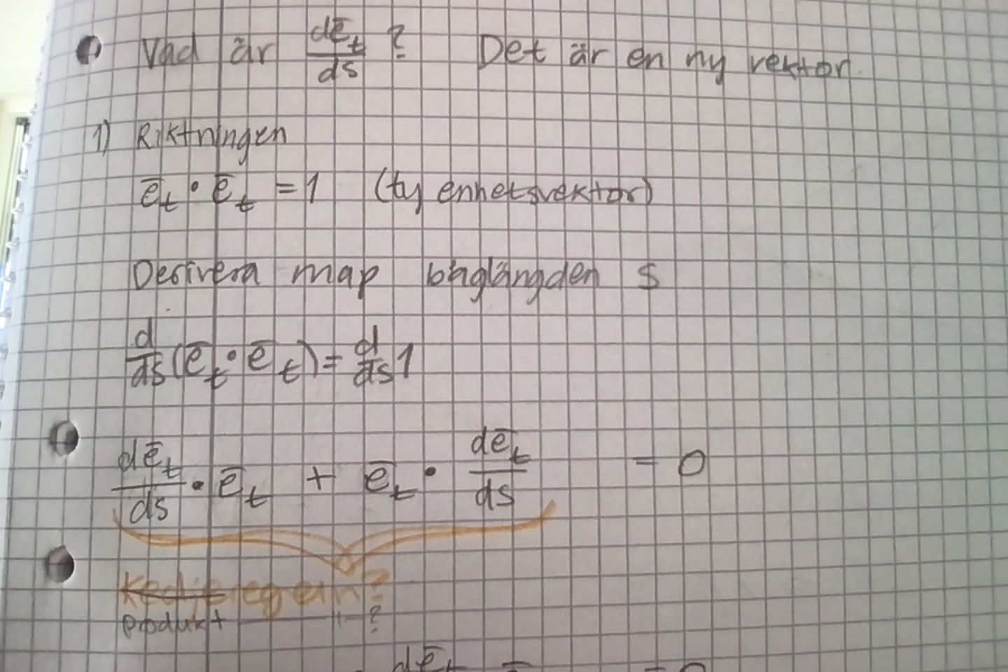 Raderna ovanför har dock avslöjat att derivatan direkt är derivatan av konstanten 1, vilket gör att det skall bli 0. Jag antar att de utnyttjar detta för att motivera att den nya vektorn är vinkelrät mot enhetsvektorn.