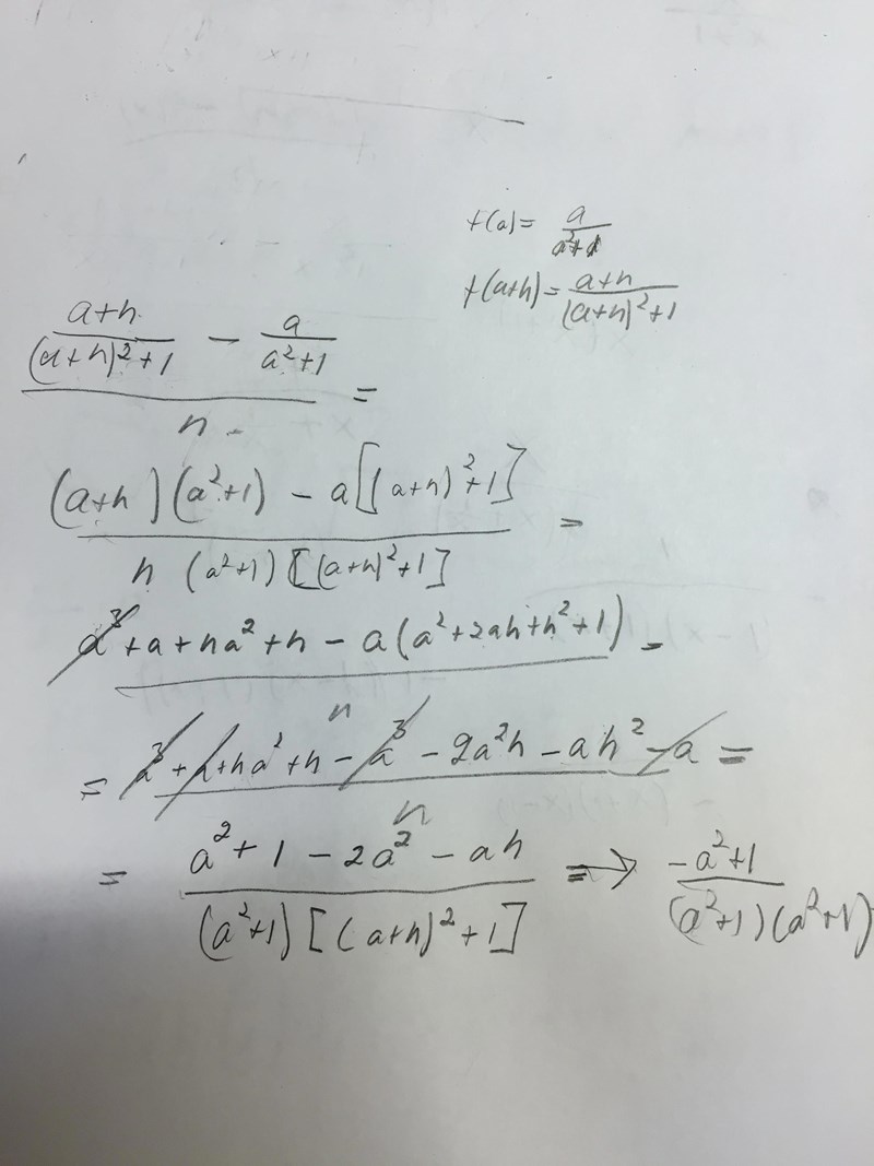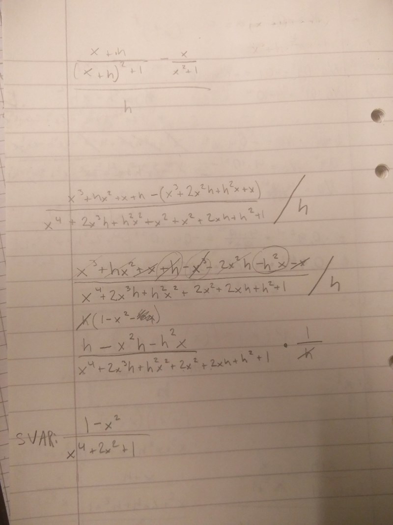 NA15 skrev :Så det enda sättet att derivera x/(x^2+1) som man får lära sig i matte 3c är genom att använda derivatans def. vilket ger ((x+h)/(x+h)^2+1)-(x/x^2+1))/h
