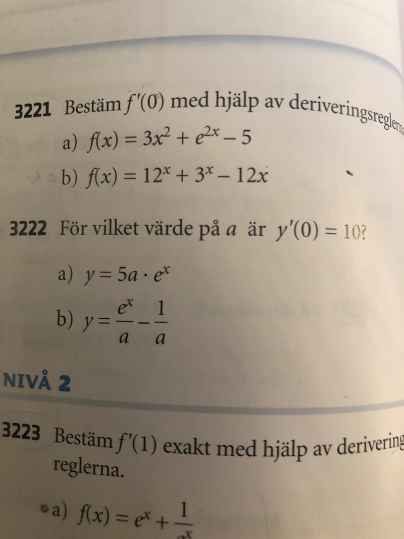 Smutstvätt skrev:Det är inte helt tydligt, eftersom de aldrig skriver eller , men eftersom de säger "För vilket värde på a är y'(0)", skulle jag anta att funktionen y beror på x, och inte a. a är en okänd konstant. Det innebär att du behöver derivera med avseende på x, inte a. :)