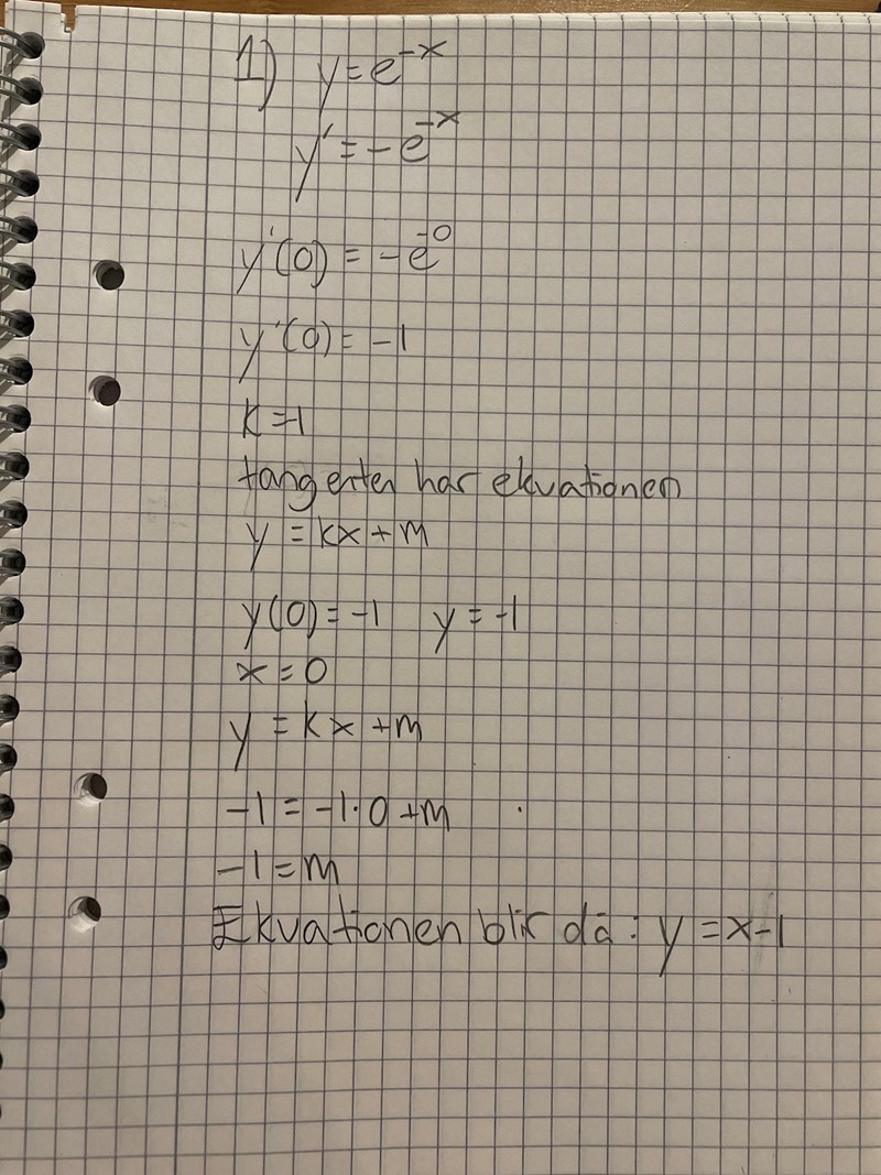 Bestäm ekvationen för tangenten i kurvan y=e^-x i den punkt där x=0