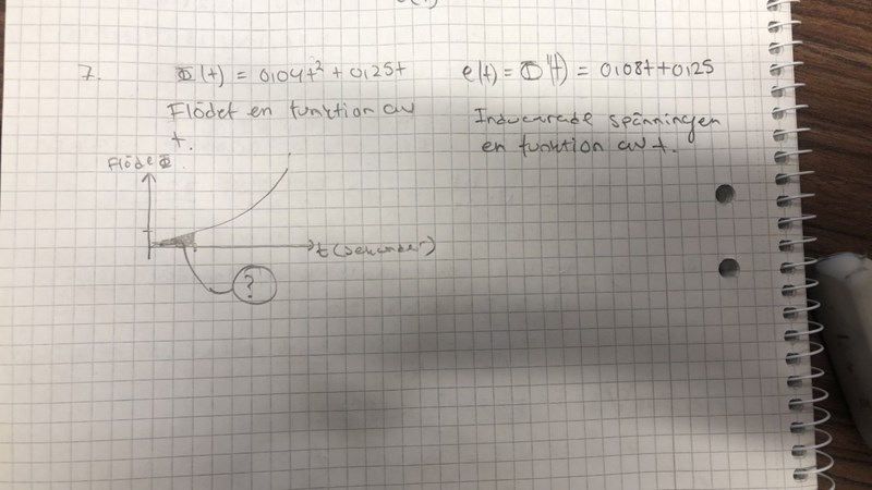 Jag har kört fast på denna uppgift. OM jag förstått det rätt, deriverar man  flödesformeln i detta exempel får man formeln för den inducerade spänningen enligt facit. Är det alltid så med alla formler om man bortser från flödes. Alltså den arean (integralen) man får under kurvan  i detta fall, vad motsvarar det? Varför måste man derivera i denna uppgift? Vad innebär den första formeln och vad innebär den deriverade formeln?