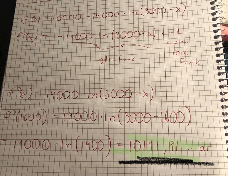 Din derivata är felaktig. Vad är derivatan av ln(x)?