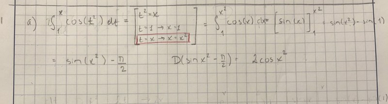 Jag antar att det blir fel på det stället jag markerat med rött, dvs att den övre gränsen inte stämmer. Tänkte sedan att derivatan av en intergral väl är funktionen, och därmed