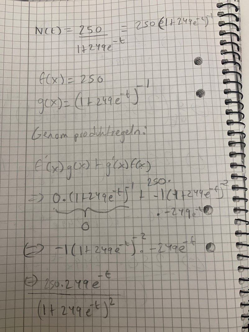 Det som jag ser är att du definierar g(x) som = 1 + 249e^-t lite senare när du ska ta derivatan, men glömmer ^-1 för hela uttrycket