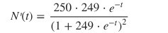 Det jag får som slutsvar är (250*249*-*e^(-t))/ (1+ 249*e^(-t))^2.