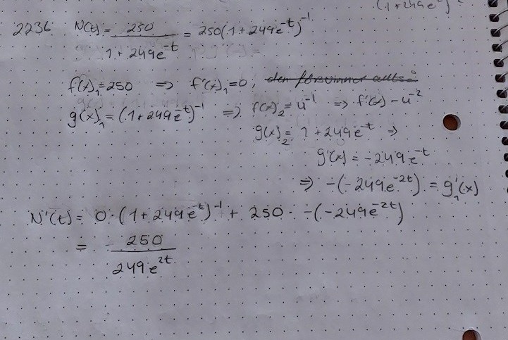 Grejen är att jag tänkte bara att derivatan av g(x) blir -1(1 + 249e^-t)^-2, vilket jag tror du inte får? Eller kanske jag trippar?