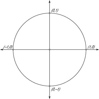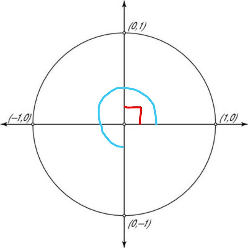 Här har vi enhetscirkeln. Kan du markera (eller skriva ut koordinaterna på cirkeln för) vinklarna pi/2 och 3*pi/2? (Omvandla till grader om det känns enklare.)