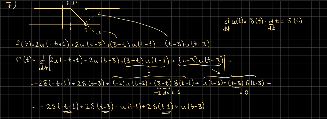 Därmed är f'(t)=2δ(t-3)-1·(u(t-1)-u(t-3))f^\prime(t) = 2\delta(t-3) - 1\cdot (u(t-1) - u(t-3)).