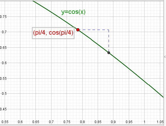 Här är kurvan cos(x), en punkt (pi/4, cos(pi/4) och en annan punkt på kurvan. Klura nu ut sidorna i den där triangeln.