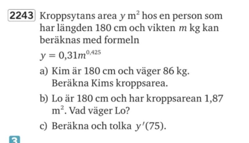 På uppgift b trodde jag att man skulle skriva 1,87=0,31m^0,425 men vet inte hur jag ska räkna ut det och om det ens är rätt.
