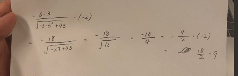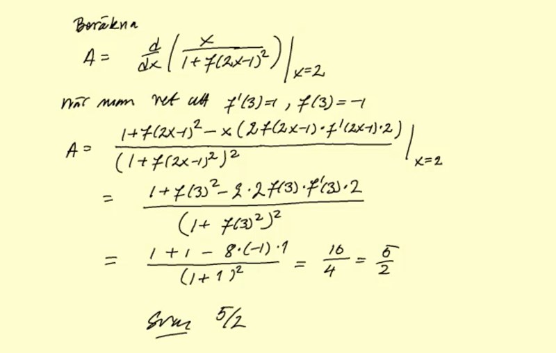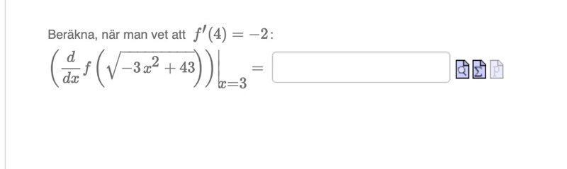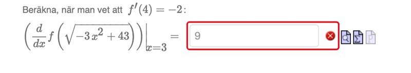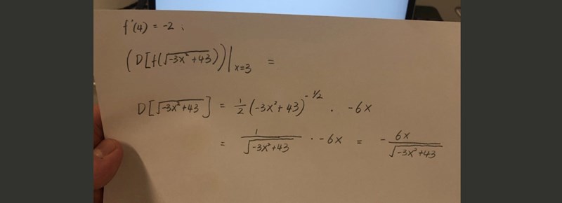Du har börjat rätt. Du har beräknat inre derivatan. Där ska byta ut x mot 3 och sen ska du multiplicera svaret med .