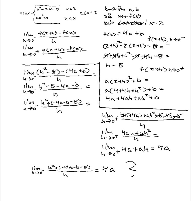 Hej jag förstår inte hur jag kommer vidare i den här uppgiften, jag har tittat på höger och vänstergränsvärde men jag vet inte hur jag skall lösa ut a och b? . Jag tror att uttrycken i a och b behöver vara 0 i båda gränsvärdena för att gränsvärdet skall existera men sen kommer jag inte vidare