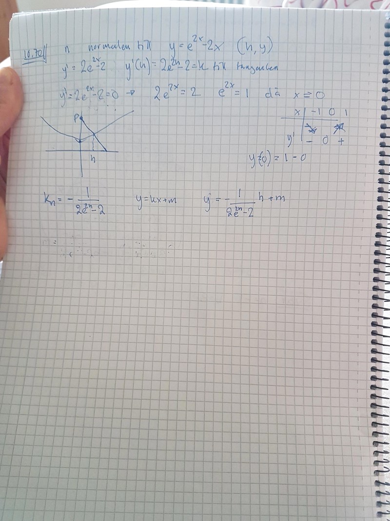 Låt n vara normal till y=e^(2x)-2x i punkten med x-koordinat h. Vidare låter vi P beteckna den punkt där moralen n skär y-axeln. Bestäm gränsvärdet av P då h->0.