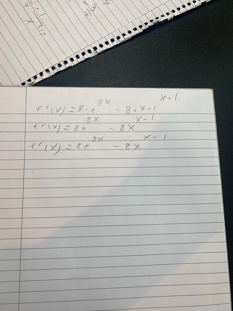 när jag deriverar f(x)=(e upphöjt till 8 gånger x ) - 8 upphöjt till x får jag att det blir o, vad är det jag gör fel. Uppgiften går ut på att bestämma f' (0).