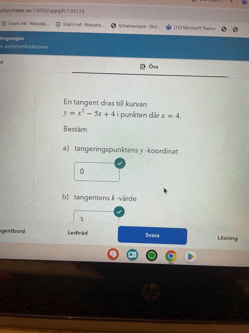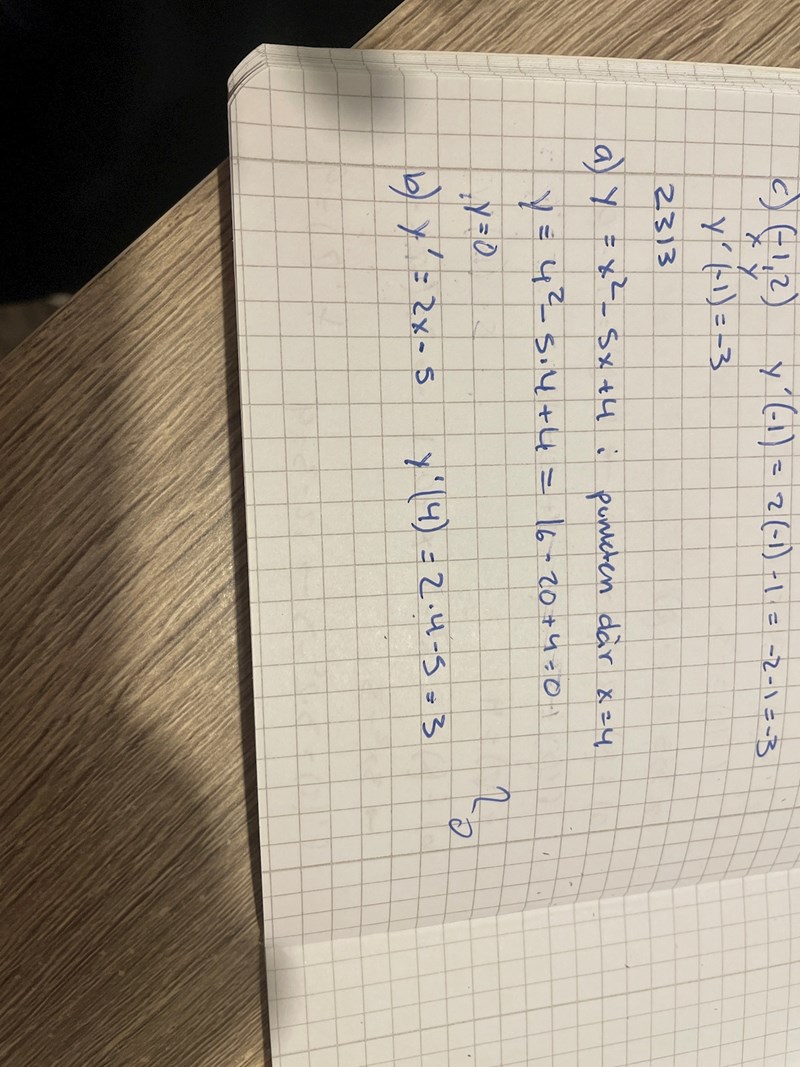 Så min fråga är på b) uppgiften. När jag ska hitta tangentens k-värde varför kollar jag inte bara på det jag deriverat? Alltså y’= 2x-5, o att k-värdet är 2? Så att tangentens k-värde är samma för den ska väll följa själva kurvan? Vet inte om jag förklarat tillräckligt utförligt hur jag tänker för det ska väll vara samma som nör jag deriverat.