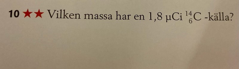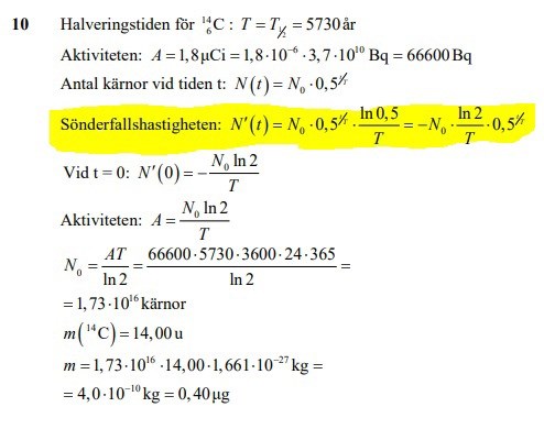 Jag förstår teorin bakom uträkningen, dvs att derivatan är lika med aktiviteten, men jag förstår inte deriveringen (markerat i gul). Skulle någon kunna hjälpa mig genom att skriva stegen som utförts hade det varit väldigt uppskattat!