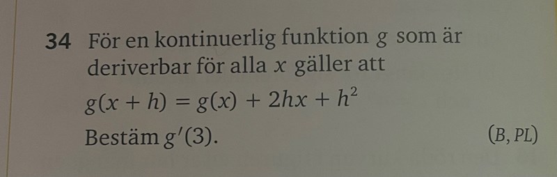 Jag har absolut ingen aning hur jag ska börja med denna uppgift. Jag tror dock att jag på något sätt ska använda mig av derivatans definition men jag vet inte hur. Skulle gärna vilja ha lite hjälp för att komma igång.