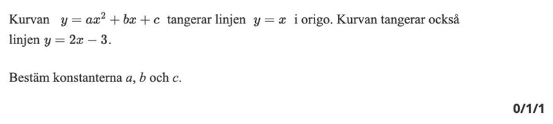 b och c fattar jag hur man löser. C är noll eftersom den går genom origo. För b derivera jag uttrycket till f'(x)=2ax+b. Sedan förstod jag med hjälp av första tangenten att om y=x=0 (origo) att b måste vara 1 för att tangenten ska ha lutningen 1 som y=x har.