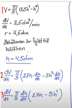 Sen ska man derivera uttrycket HL med avseende på tiden, vilket borde bli (dV/dt)*(dh/dt), alltså att man deriverar med avseende på tiden, men så blir det ju inte på första termen utan då deriverar man ju volymen med avseende på höjden! Varför säger man då att man deriverar med avseende på tiden när det är höjden? För som ni ser på 3, så deriverar man h som variabeln...