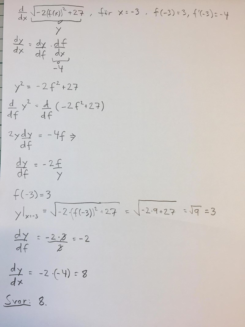 Tänker att man deriverar med yttre och inre derivata på något sätt och sen sätter in värdena för f(-3) och f'(-3) men får fan inte till det...
