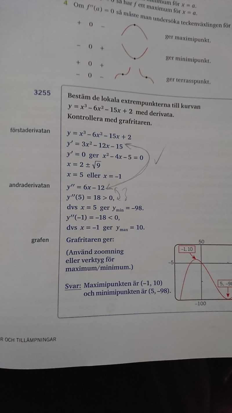 Laguna skrev:De x-värden som ger y' = 0 har du precis räknat ut.