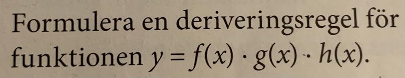 Jag tror det blir lättast att skriva ihop två av funktionerna till en och sen utveckla. Vi kan kalla t ex m(x) = g(x)*h(x) så y = f(x) * m(x). Tror du att du kan börja derivera nu? :)