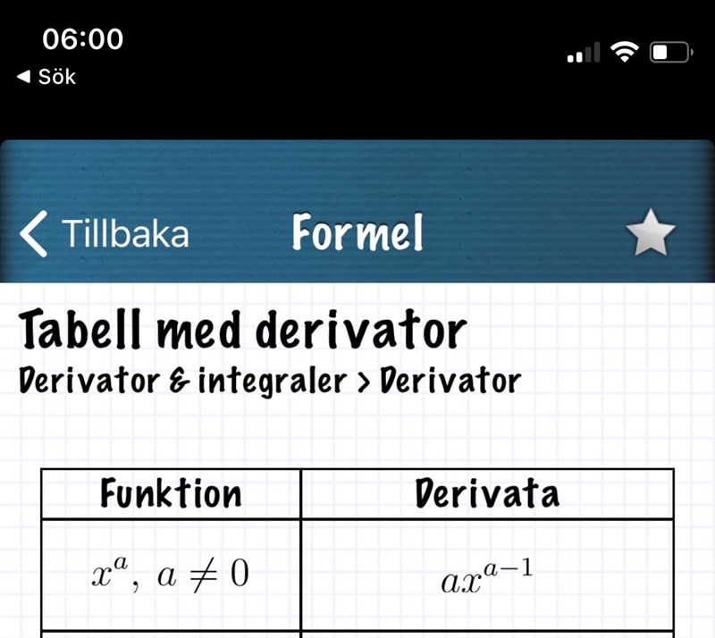 Jag har nu repeterat men är fortfarande lite förvirrad. √x blir 1/2√x men 6√x blir 3/√x. Ska inte 6√x bli 3/2√x? Jag syftar på detta: