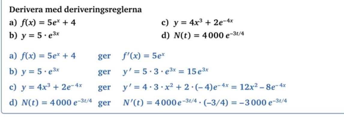 I Uppgift D. Varför tar man inte minus 4/4 i exponenten?? Enligt Deriveringsreglerna ska väl 4000 multipliceras med exponenten och exponenten skall subtraheras med 1??