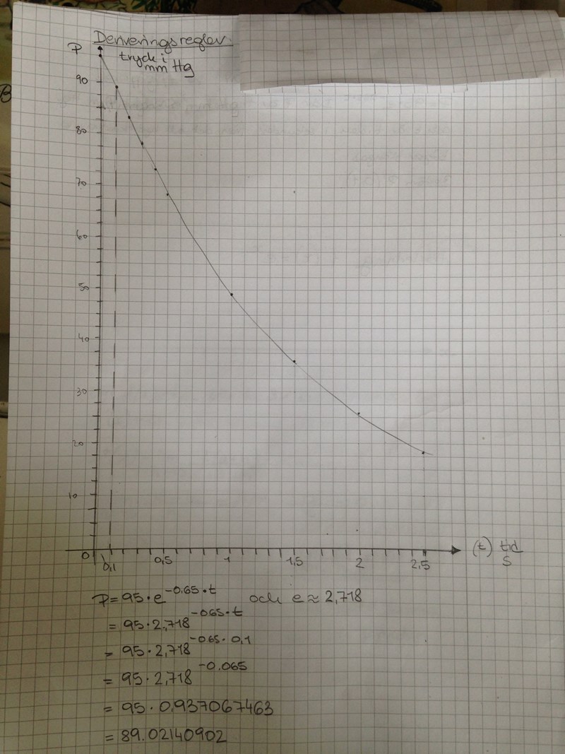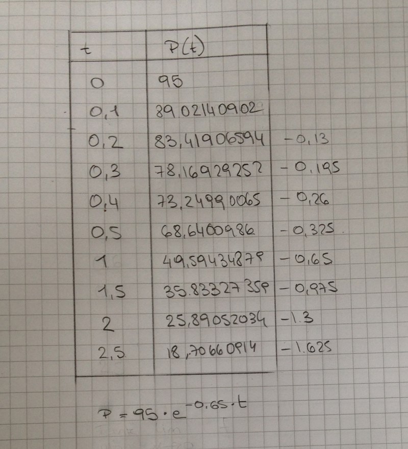 Med tanke på din rubrik är det troligen meningen att du skall drivera funktionen P=95⋅e^−0,65⋅t mede hjälp av deriveringsregler och sedan sätta in t = 0,1.