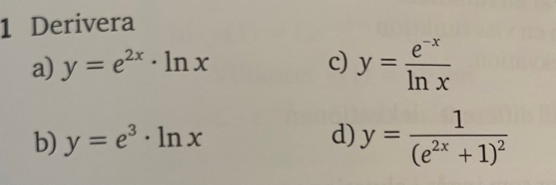 Kolla up derivatan av en produkt. I a) är det (derivatan av e^(2x)) * ln x + e^(2x)* derivatan av ln x =