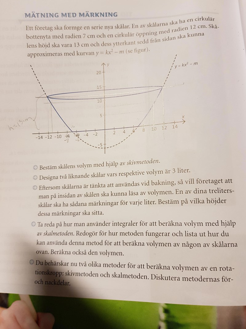 Har problem med uppgiften som handlar om att designa skålar. Jag har kommir fram till att skålen på bilden har volymen 3.94 L och har då använt mig av rotationsvolymer. Men vet inte riktigt hur jag ska börja på andra uppgifter där jag själv ska designa två skålar respektive med volymen 3 L, någon som kan ge tips?