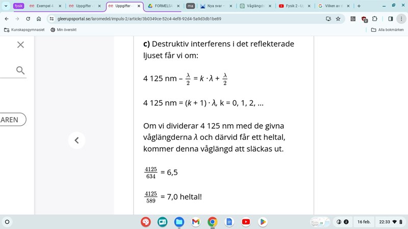 och här ser vi att både 634 och 589 och 530 ej ger heltal så då borde alla de ge destruktiv interferens? Eller vill man kanske endast att de ska vara en halv våglängd ifrån varandra och därav väljer våglängden 589